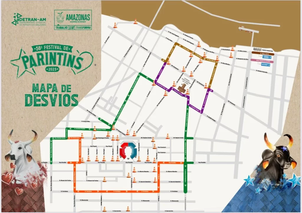 O Departamento Estadual de Trânsito do Amazonas (Detran-AM) divulgou, nesta segunda-feira (23/06), um plano de mobilidade desenvolvido para o município de Parintins (distante 369 quilômetros de Manaus), e que será utilizado durante o 58º festival. A iniciativa visa manter a fluidez das principais vias de acesso da cidade, bem como a segurança viária, reduzindo assim o índice de sinistros.