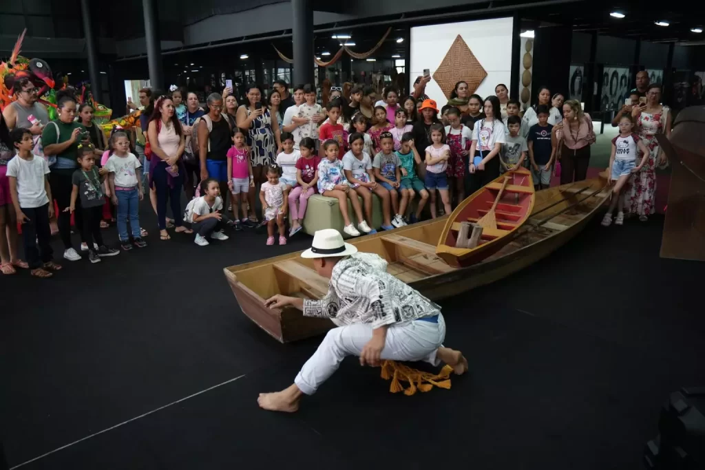 A visita guiada ganhou vida com personagens das lendas amazônicas, como o Curupira, a Iara e o Boto, que conduziram as crianças pelos espaços do centro cultural, misturando ficção e conhecimento sobre o folclore amazônico. A experiência encantou os pequenos e ajudou a reforçar o pertencimento cultural desde a infância.