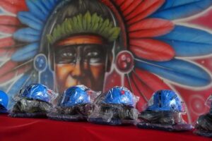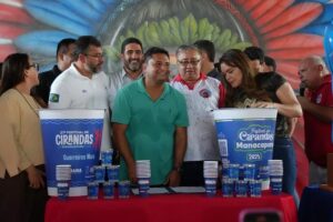O governador Wilson Lima esteve neste sábado (09/08) em Manacapuru (a 68 quilômetros de Manaus) para acompanhar os preparativos das cirandas que participam do 27° Festival de Cirandas, Flor Matizada, Guerreiros Mura e Tradicional. O governador entregou 150 kits de Equipamentos de Proteção Individual (EPIs) para artistas e trabalhadores dos galpões, além de formalizar a doação de 50 mil copos de água envasados e temáticos para o evento. O investimento estadual recorde para o festival de 2025 é de R$ 7,6 milhões.