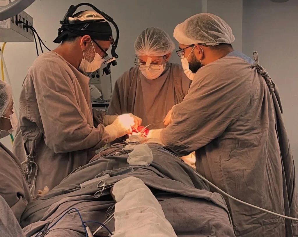 A cirurgia mobilizou médicos altamente especializados das áreas de bucomaxilofacial, microcirurgia de cabeça e pescoço, além de cirurgia plástica. De acordo com o cirurgião bucomaxilofacial Flávio Fayad, o planejamento do procedimento envolveu exames detalhados e discussões clínicas ao longo dos últimos meses. “Foi uma cirurgia complexa, mas conduzida com precisão. Realizamos a ressecção completa do tumor, instalamos uma placa de reconstrução mandibular e, por fim, fizemos um enxerto de fíbula vascularizada, técnica que utiliza parte do osso da perna para reconstruir a mandíbula”, explicou.