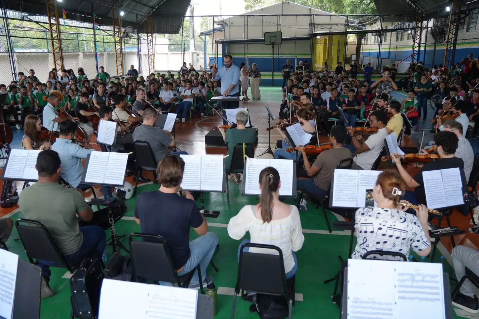 Nesta sexta-feira (19/09), a Escola Estadual Sant’Ana, localizada na zona Sul de Manaus, foi palco de uma experiência única. Alunos e professores tiveram a oportunidade de vivenciar de perto a apresentação da Amazonas Filarmônica, dentro do projeto Vivência Cultural. O encontro também marcou uma data especial: os 28 anos da orquestra, celebrados com um parabéns coletivo cantado pelos estudantes ao final do concerto, que foi encerrado com a execução do Hino Nacional.